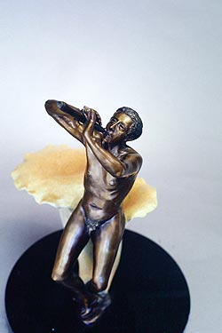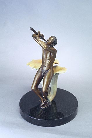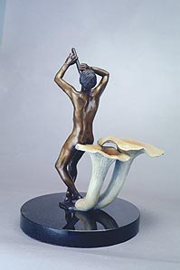 Beckoning is a man looking for a new direction in life. He is lost in the wilderness and pauses on a mushroom (Gomphus floccosus). Raising his flute, he calls out in hope that Mother Nature will find him and show him the path through life.